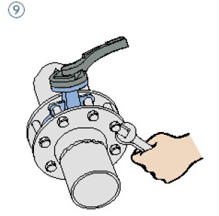 (7)校正阀门位置并将四对螺栓拧紧, (注意不要拧得过紧)
