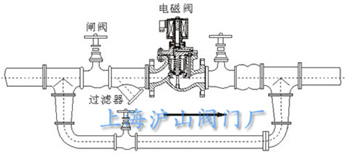 4、在电磁阀发生故障时,为了及时隔离电磁阀,并保证系统正常运行,最好安装旁路装置。如下图: