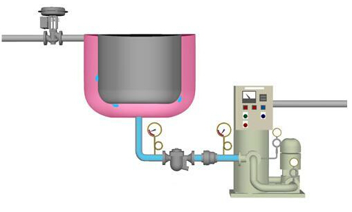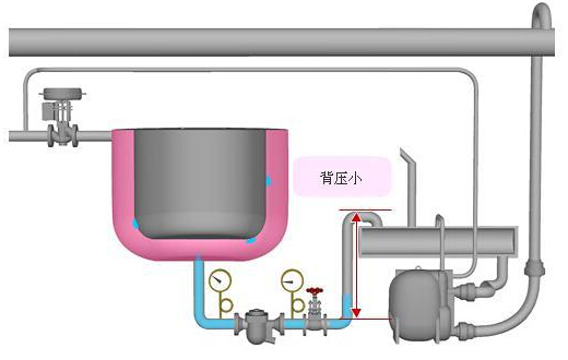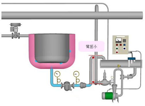 使用一台真空泵可以降低出口压力。当使用真空泵时,疏水阀后端管道(冷凝水回收管线)会降至负压,这样就能保持疏水阀所需的工作压差。